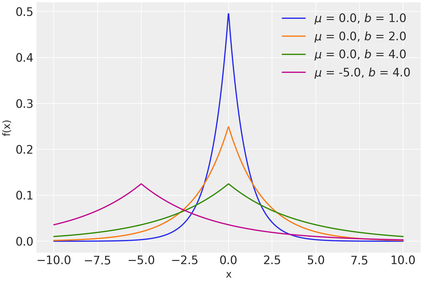 \[f(x \mid \mu, b) = \frac{1}{2b} \exp \left\{ - \frac{|x - \mu|}{b} \right\}\](