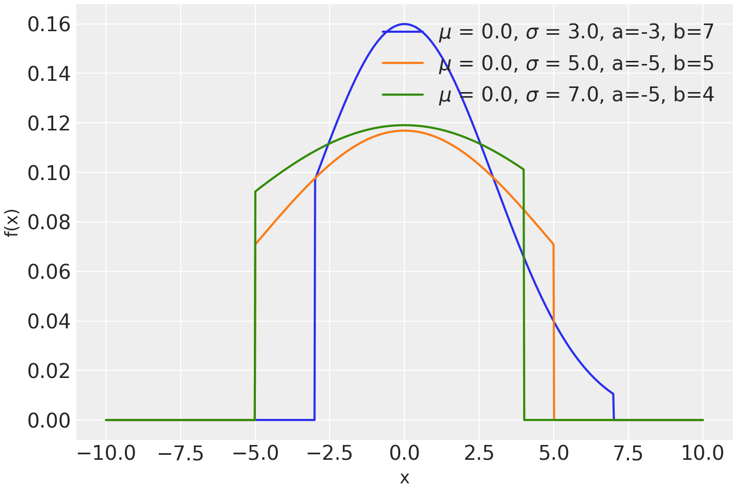 \[f(x;\mu ,\sigma ,a,b)={\frac {\phi ({\frac {x-\mu }{\sigma }})}{ \sigma \left(\Phi ({\frac {b-\mu }{\sigma }})-\Phi ({\frac {a-\mu }{\sigma }})\right)}}\]Truncated normal distribution can be parameterized either in terms of precision or standard deviation. The link between the two parametrizations is given by
